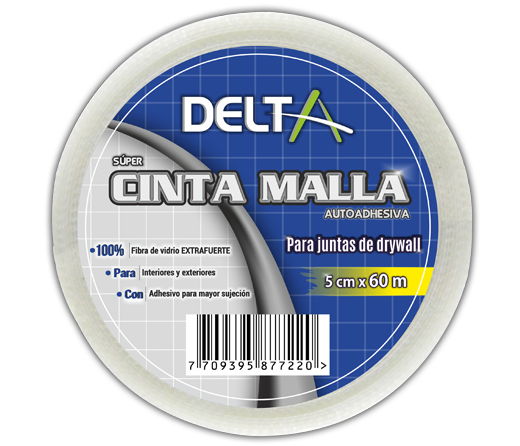 Cinta malla en fibra de vidrio recomendada para uniones drywall, compuesta de fibra de vidrio autoadhesiva en forma de cuadricula, se utiliza para el tratamiento de pequeñas reparaciones de juntas de placas de yeso, estuco, ladrillo adémas de tratamiento de juntas en muros con placas de cemento, fibrocemento en interiores y exteriores.