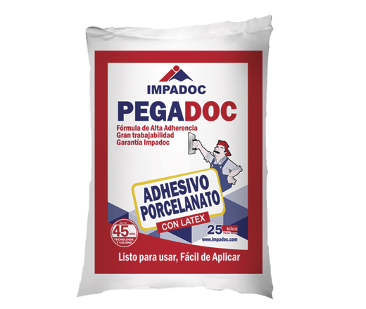 - PEGADOC PORCELANATO: Para instalación de revestimientos cerámicos de baja absorción. Puede utilizarse en pisos o paredes. Diseñado para uso en interiores y exteriores.